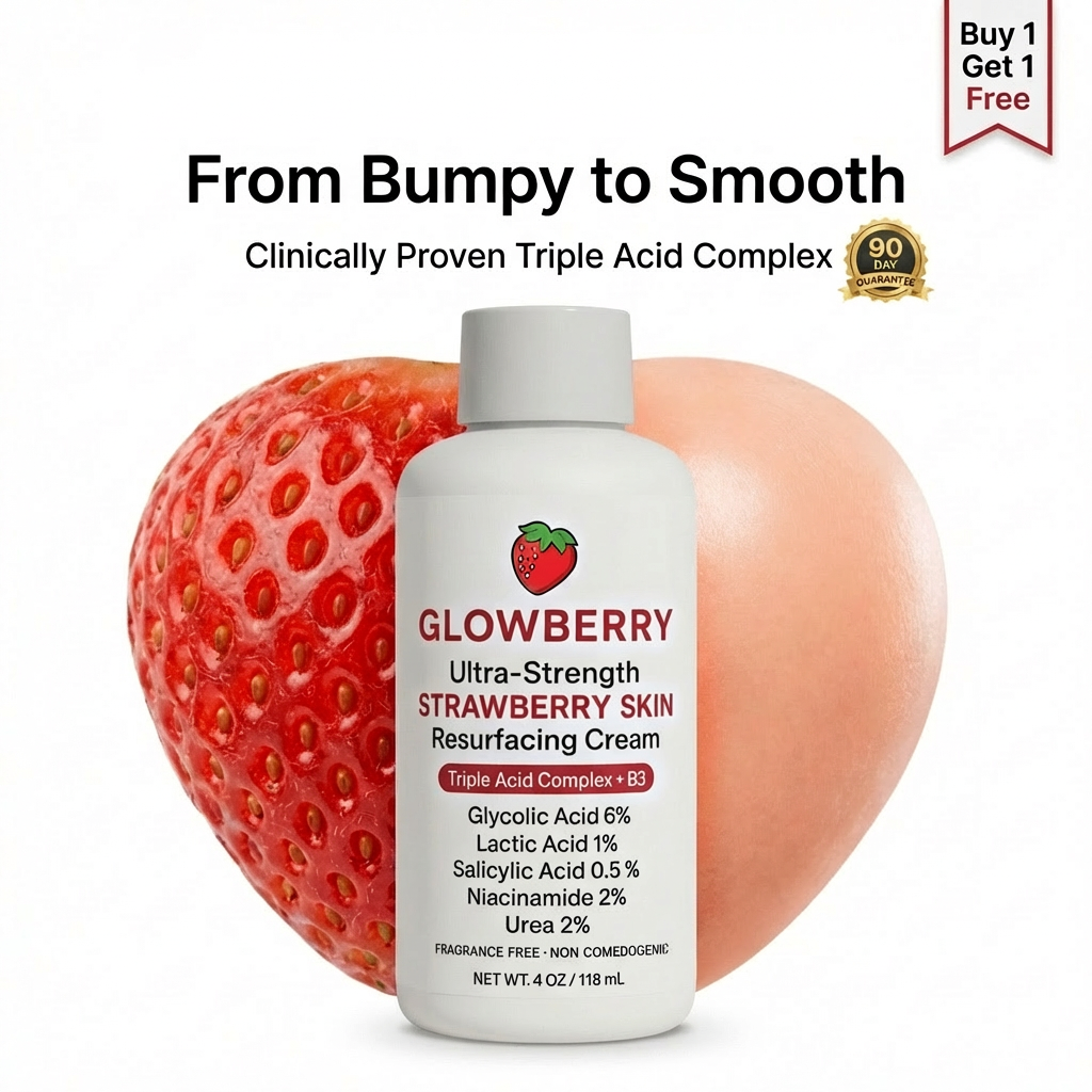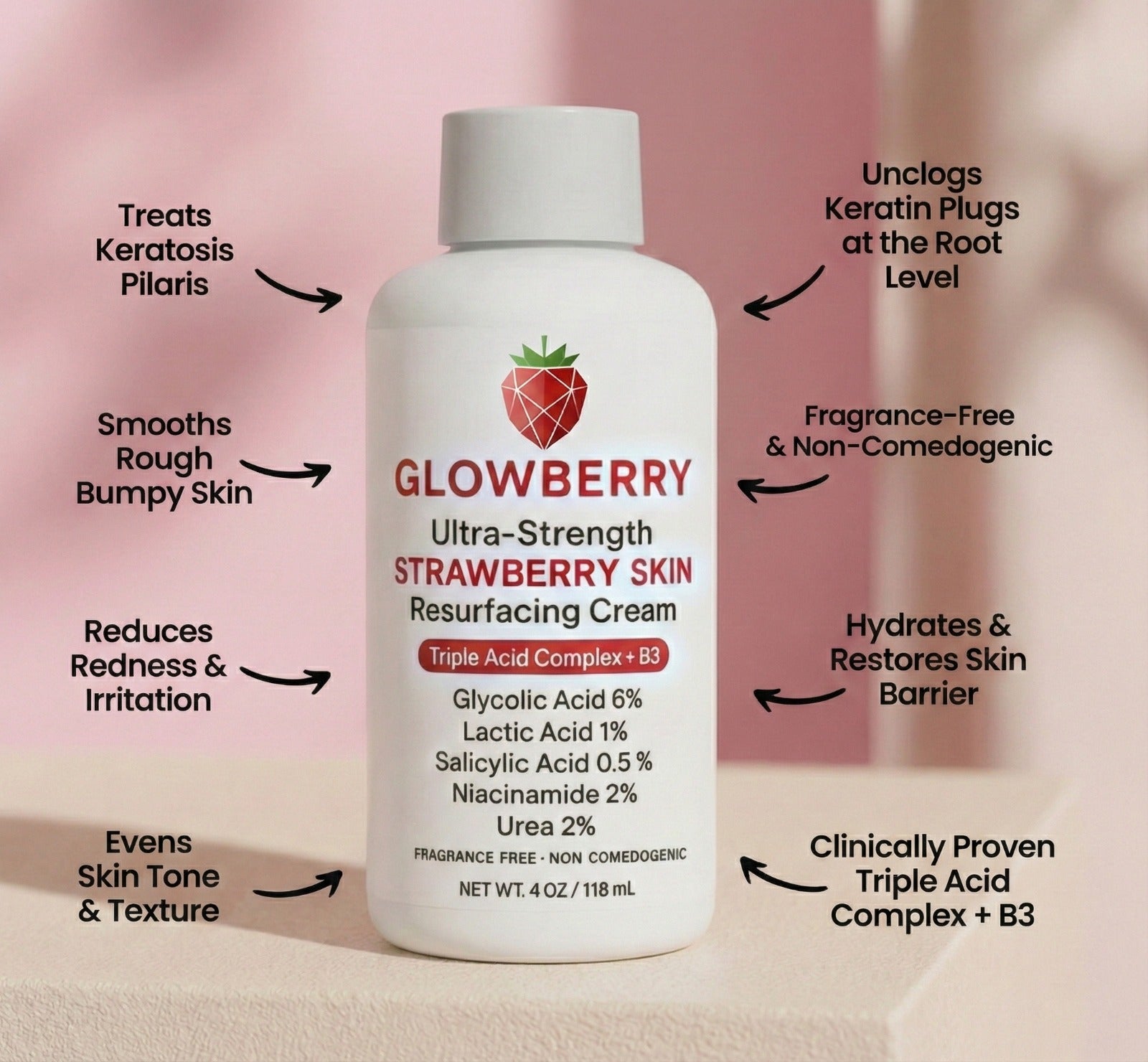Glowberry is the first dermatologist formulated treatment specifically designed to address both the bumpy texture AND redness of keratosis pilaris. Our proprietary triple-acid complex targets KP at its source. The excessive keratin buildup that plugs hair follicles and causes inflammation.